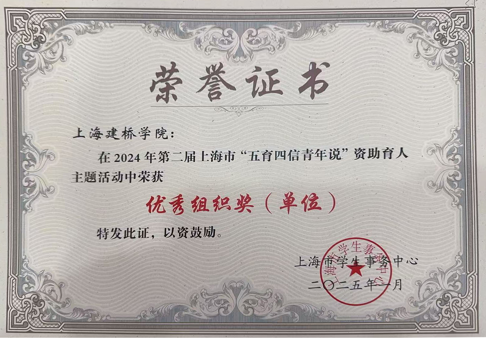 | 2025年1月 | 2024年第二届上海市“五育四信青年说”资助育人主题活动优秀组织奖 |
