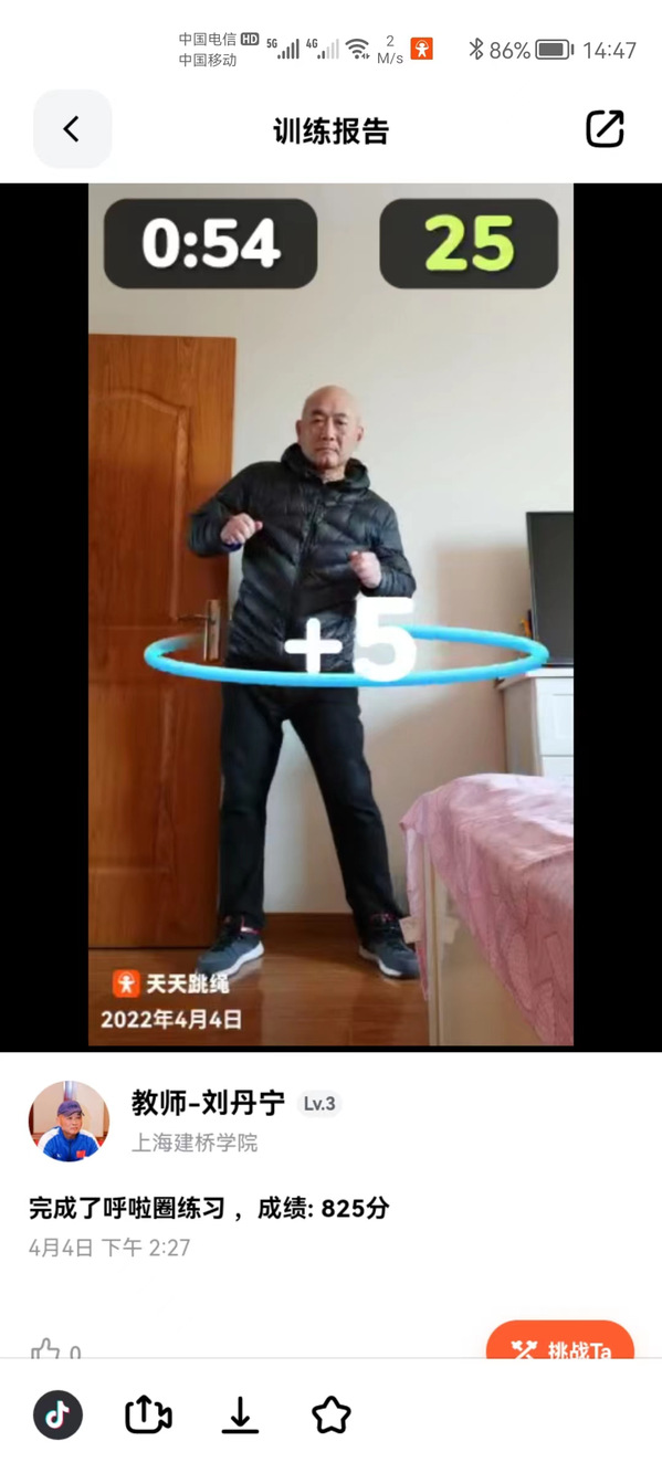 疫情防控期间,学生居家学习生活,足不出户,锻炼活动大大减少。学校体育教学由线下转至线上,为了让同学们在宿舍或在家狭小的空间也有能力、有效、有目标地进行体育锻炼,帮助学生在室内体育锻炼中享受乐趣、增强体质、健全人格、锤炼意志,提升自身免疫力,坚定战疫信心。“怎样上好线上体育课”也就成为体育教研室教师共同探讨的课题。刘丹宁老师认为,线上体育教学要符合体育课的一个主要特点,即以身体练习为主,也就是练起来、动起来,达到增强学生体质、提升免疫力抗击疫情的目的。同时,学生锻炼的项目要具有可控性、指导性、趣味性和娱乐性。根据线上体育课程教学独有的特点,刘丹宁老师通过学习通平台完成体育理论教学外,结合当代大学生的年龄和身心特点,不断寻找和挖掘更多优质教学资源,充分利用“天天跳绳”这款软件软件,有序整合体育课的“空中课堂”。“天天跳绳”APP,运动项目多,种类全,各种AI运动游戏丰富多彩,简单易学,既锻炼身体,又能带来乐趣,打破时间和空间的限制,只需小小的一块地方就可以登场,非常适合目前“宅”的学生。在教学中,刘丹宁老师经常利用课余时间熟悉“天天跳绳”软件操作,对软件中的练习项目亲自练习,找出每一个项目