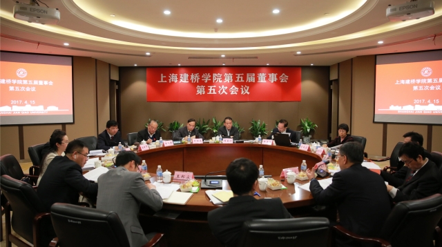 第五次会议。2017年4月15日召开。会议主题为“问题导向,稳重求进”。会议听取了潘迎捷校长关于学校师资队伍建设、分配制度改革、机关大部制改革的情况汇报。会议认为,师资队伍建设是学校“十三五”期间最重要的工作,要从战略和全局高度,以做好教师思想政治工作为抓手,坚持积极引进、充分使用和立足培养三管齐下,把建设一支高水平、高素质的师资队伍作为建设一流民办大学最重要的任务。会议听取并审议了郑祥展副校长关于2016年度财务决算、2017年度财务预算的报告。会议指出,尽管新校区建设还本付息压力大,但预算中人员经费、教学业务经费、学生活动经费、学科建设经费等依然保持了较大增幅,董事会将不遗余力支持学校内涵建设、改革发展,但全校上下依然要清醒地认识到,经费不足问题还将长期存在,一定要进一步增强节俭办校意识,千方百计开源节流。会议通过了2017年度预算安排。会议审议并通过了《上海建桥学院教师住房公积金实施办法》。会议还专题学习了《民办教育促进法》修订案、全国和上海市高校思想政治工作会议精神,专题讨论了教育部2025中国智能制造产教融合推进计划项目、完善学校仲裁机制、加强学位点建设、加强教育发展基金会工作等事宜。本次董事会议还首次安排教师代表(马长伟、宋艳华、马振),学生代表(雷强、申茜茜)参加,是建桥民主管理的又一新尝试。
