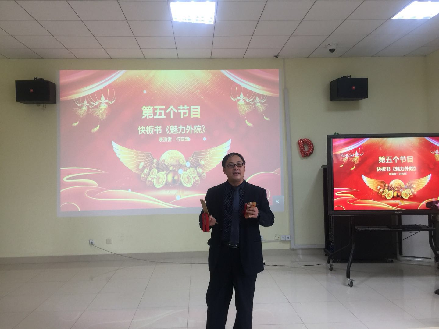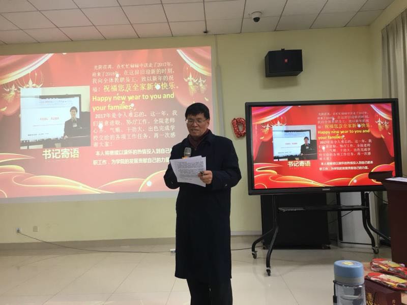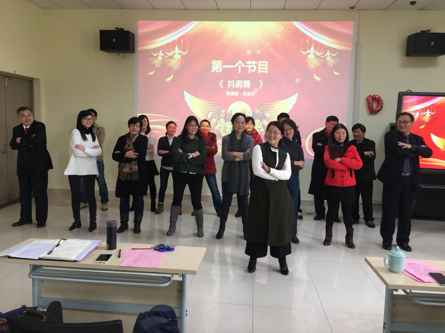 本次联欢会由外国语学院工会主席董显洋老师和大英部房梦华老师主持,党总支书记杨大亮教授发表了热情洋溢的新年致辞。最后,活动在全体教师合唱《团结就是力量》的温馨、欢快的气氛中圆满结束。