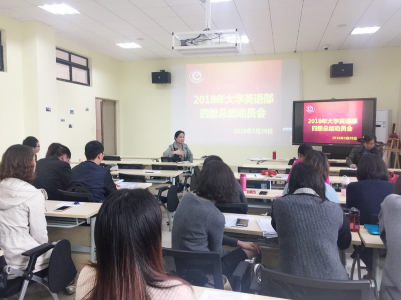 3月29日下午,外国语学院大学英语部召开2018年大学英语部四级总结动员会。学院吕乐院长、王海燕副院长、杨大亮书记、李雷副书记、 以及大英部全体专职教师参加。