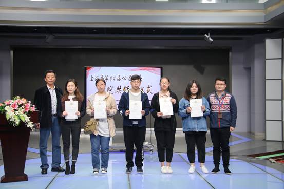 上海市工商行政管理局广告监督管理处副处长李华,上海建桥学院校办副主任徐皓刚,上海市广告协会副秘书长兼公益广告工作委员会秘书长倪嵎为获得本届大赛各组别二等奖的获奖院校颁发奖状并合影留念。