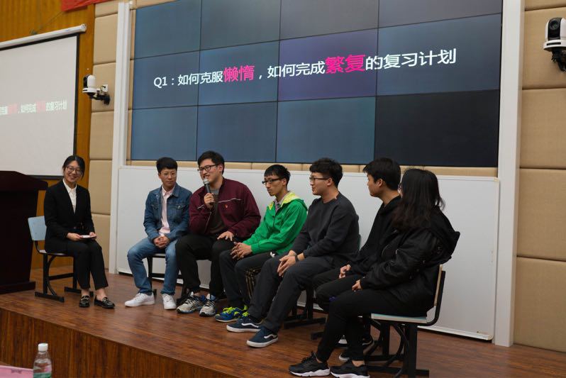 第二个环节中,“准研究生”陆家兴、朱志民、方仲礼、徐嘉玮、李元光和解天扬六位学长学姐分享了考研经验:考研需不断要积累,掌握技巧;要树立信心、不轻言放弃,同学们收获颇丰。