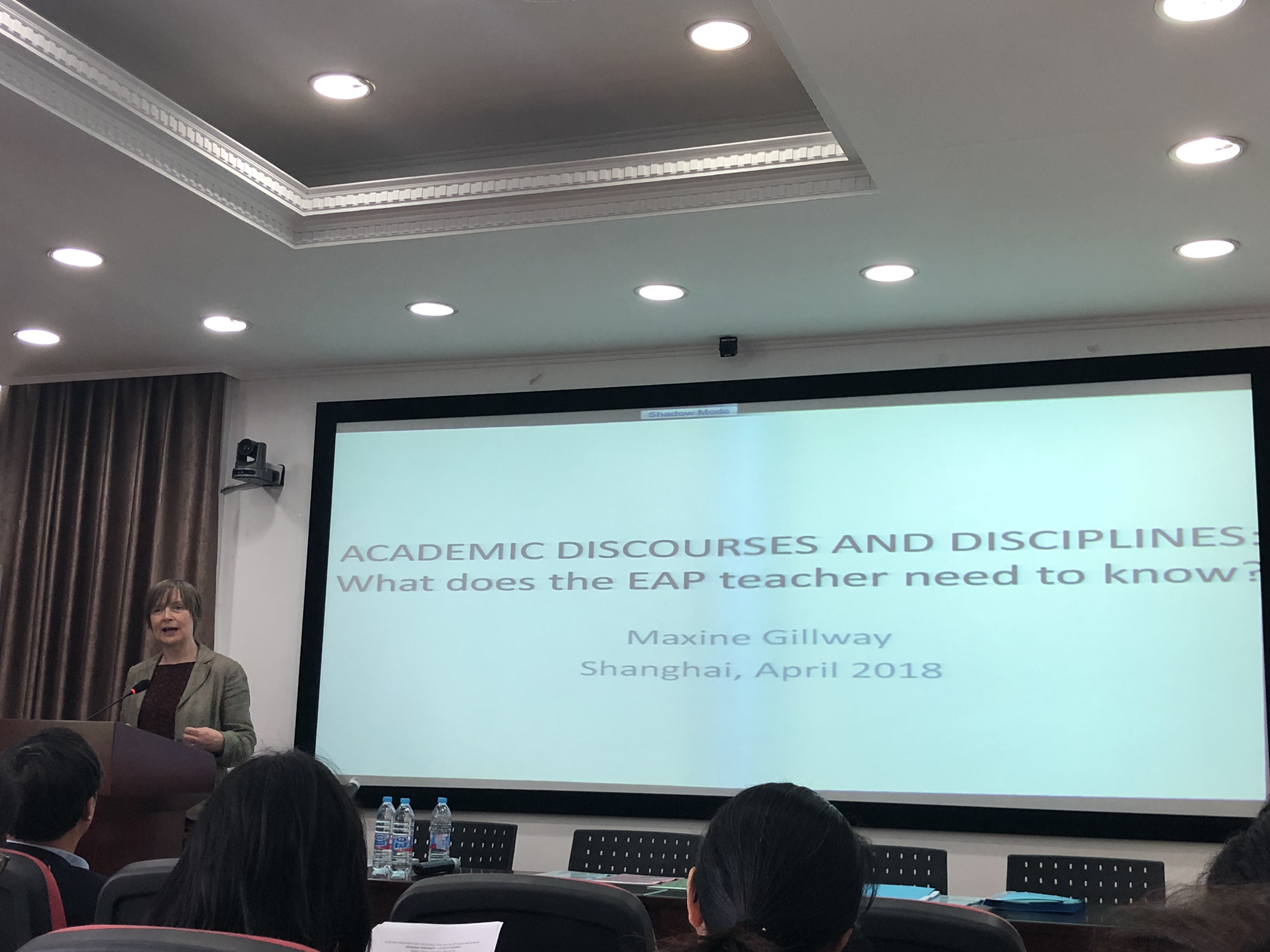 在这次研讨会上,上海市外语教学指导委员会主任蔡基刚教授蔡基刚教授致开幕词。本次研讨会特邀英国布里斯托大学英语语言中心主任、英国学术英语教师协会(BALEAP)会长Maxine Gillway教授做了题为Academic Discourse and Disciplines和Catetring for Diverse Needs的两场专题讲座。Gillway教授首先详细阐述了学术英语(EAP)教学中的一些重要概念和原则,介绍了如何以读者(audience)和写作目的(purpose)为宗旨,从内容(content)、语言(language)和结构(organization)三个方面来评析学生的学术英语写作水平。同时穿插了许多丰富的教学实例,向大家现场展示了如何在摸清学生需求的基础上,提供有针对性的学术英语写作指导和修改意见。在Gillway教授的发言结束后,多位高校教师代表积极提问讨论,讨论气氛十分热烈。