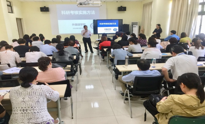5月24日,科研考核实施方法沟通会在外国语学院129英语情景教室举行,学校科研处处长张维生出席会议,外国语学院领导及全体教职工参加,会议由外国语学院院长吕乐教授主持。