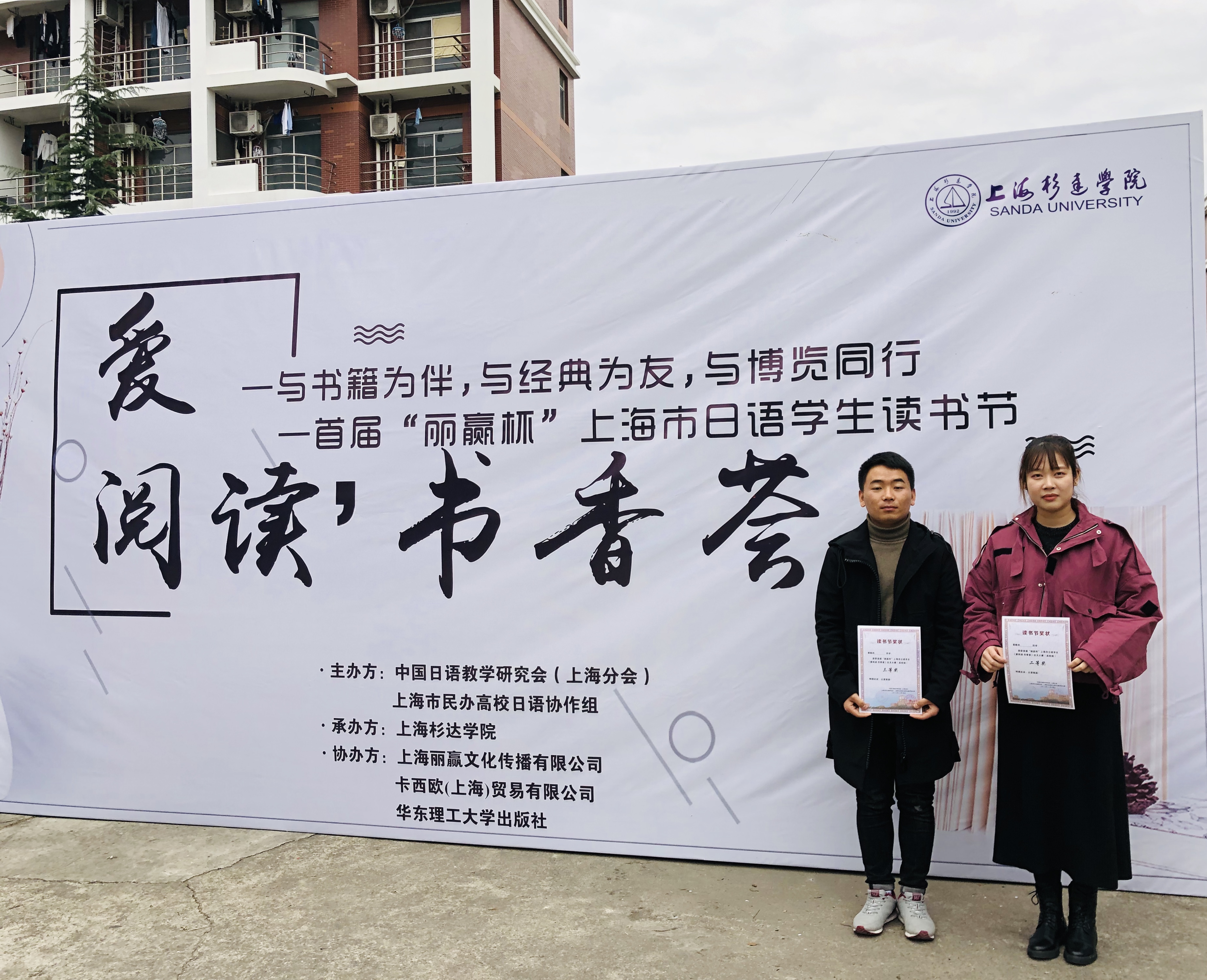 12月4日,首届“丽赢杯”上海市日语专业学生“爱阅读书香荟”征文大赛颁奖典礼上海杉达学院三创中心举行,外国语学院16级日航班的朱若嘉同学荣获二等奖,18级本日3班的范伟同学荣获三等奖,日语系刘尔瑟老师和郑玲玲老师获得优秀指导教师奖。