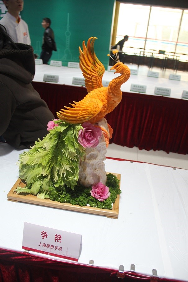 比赛吸引了沪上40所高校和单位的180位选手参赛。大赛最终呈现红案菜肴120个,白案点心117个,食品雕刻24个。所有菜品在比赛现场制作呈现。我校参赛的菜品中韭菜煎饺、清蒸狮子头、双椒牛仔骨、香菇素菜包、小笼汤包获得大赛铜奖。我校的雕花作品《争艳》色彩明艳,栩栩如生,引人驻足观看。