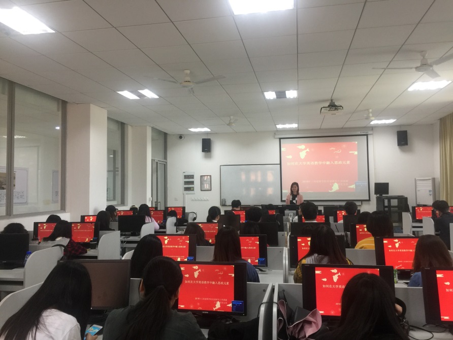 陈永明老师以上海外国语大学课程思政改革为例,结合我校师生实际情况,向在场的老师和同学介绍了大学英语课程思政教学改革的思路和途径,比如:开设素质拓展课程来传播中国文化等。金艳老师结合自己的课题“如何在大学英语教学中融入思政元素”,从教学内容、教学方法、考核评价等三个方面跟大家分享了如何将思政元素融入到实际教学中去。