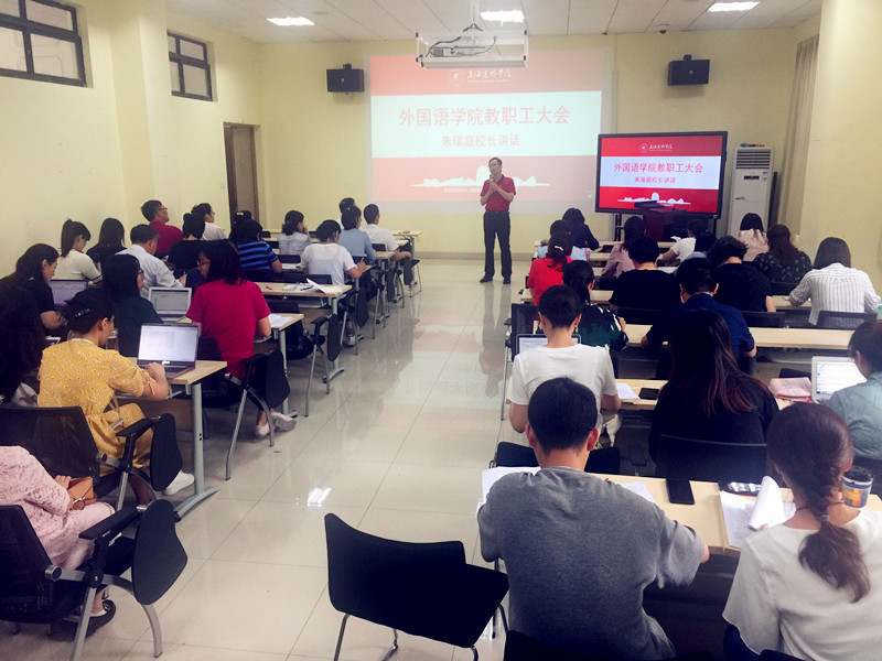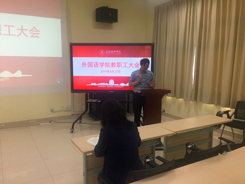 6月27日,外国语学院在学院129会议室召开了全院教职工大会,校长朱瑞庭,外国语学院院长毛立群,党总支书记江萍,代理副院长、大英部主任陈永明,办公室主任董显洋,党总支副书记孙俊芳及全体教职员工参加了会议,会议由党总支书记江萍主持。