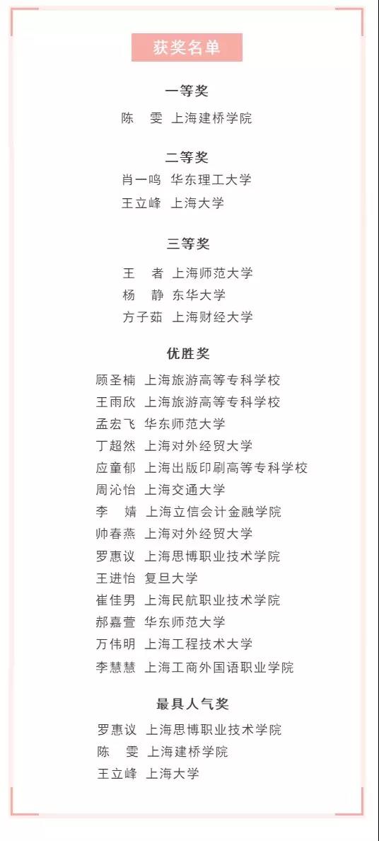 12月8日,“玩转职场人生”2019上海市大学生模拟求职大赛总决赛在华东理工大学(徐汇校区)逸夫楼报告厅举行,共有来自各高校的20位选手突出重围杀入决赛。我校商学院大三学生陈雯获得大赛一等奖和最佳人气奖,并且获得了中国平安等4家知名企业的免面试offer,可直接入司实习。我校学生处副处长王苇获“优秀指导教师奖”,我校获 “优秀组织奖”荣誉称号。