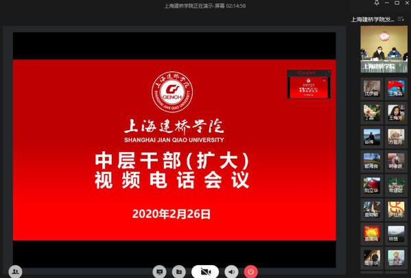 2月26日上午,学校以视频会议形式召开全校中层干部(扩大)会议,深入贯彻习近平总书记关于坚决打赢新冠肺炎疫情防控人民战争、总体战、阻击战的重要讲话精神和指示批示精神,全面落实党中央、国务院应对疫情工作决策部署和教育部党组、上海市委市政府各项工作要求,通报学校疫情防控工作和各学院教育教学筹备情况,研究部署下一阶段疫情防控工作和学校当前的重点任务。校疫情防控工作领导小组组长、校长朱瑞庭主持会议,校疫情防控工作领导小组组长、党委书记江彦桥在会上发表讲话。校领导杨俊和、郑祥展、夏雨、俞晓光、陈伟出席会议。全体中层干部,院处长助理、院办主任等参加会议。