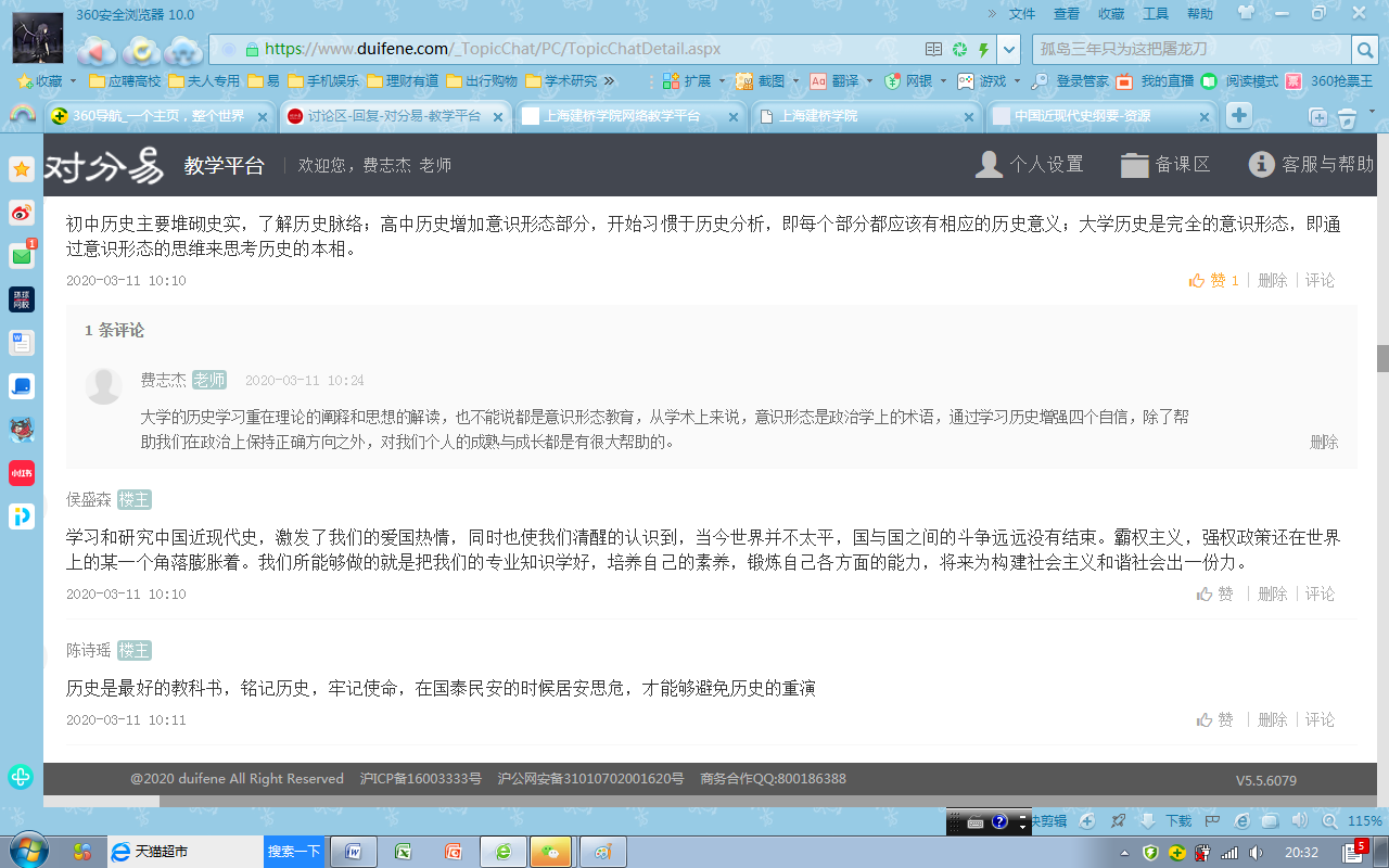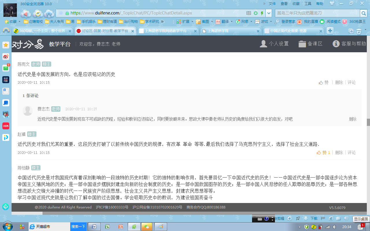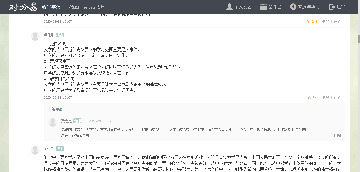 一是时间安排比较紧凑合理。为了提升课堂90分钟的互动效率,他把每一分钟都进行了合理分配,争取做到不浪费一分钟。如课前上课提示、上课考勤、在线测试、在线随堂提问、重难点讲解、集中讨论、课堂总结等多个教学环节,学生普遍感觉受益匪浅。二是内容较为丰富、形式较为灵活。从对分易签到码的发布,到缺勤学生的督促与询问;从在线测试题的开始,到测试成绩的发布;从随堂提问,到学生抢答;从不同讨论话题的选择,到学生自由设置讨论话题,让全体学生都尽情参与,最大程度上防止游离于课堂之外的现象出现。三是学生的参与度非常高。由于老师课前准备充分,绝大多数同学都参与其中,有点评也有发言,极大的提升了思政课的教学效果,激发了同学学习思政课的兴趣和热情。费老师以史论史,以史叙事,做到了从历史中解读人生,解读价值,使学生在学习历史中树立正确的价值观,真正达到思想政治教育的目的。