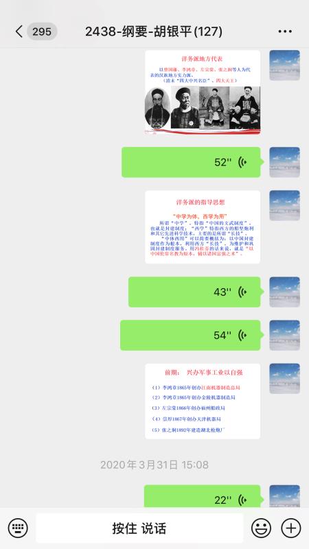 第三,在线教学采用的主要方法是:首先学生根据老师在超星平台布置的预习内容进行自学,然后老师在微信中进行语音讲解、发布PPT、图片等,最后在对分易讨论互动、在线测试等。上课一开始,先对学生预习和作业的情况进行反馈,尤其是对作业中出现错误的题目进行了纠正。接着详细讲授了本节课洋务运动的重点内容。