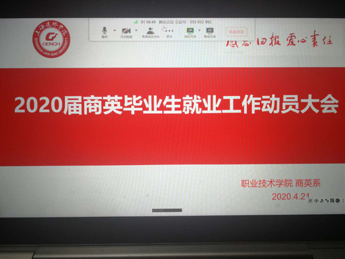 4月21日晚,职业技术学院商务英语专业通过线上平台召开2020届毕业生就业动员会议。学院党委副书记潘明芸出席,毕业班辅导员、商英专业教师及全体应届毕业生参加。会议由商务英语专业主任臧玉洁主持。