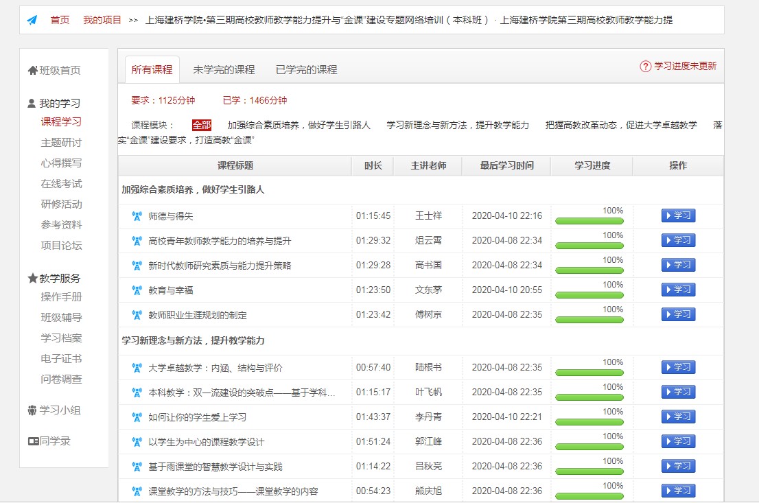 本次培训包括课程学习、主题研讨、成果撰写、在线考试四个环节,参训学员有组织地利用网络自主学习。培训围绕“把握高教/职教改革动态,促进高教教学发展”“学习新理念新技术新方法,提升教学能力”“落实金课建设要求,打造高教金课”“厚植家国情怀,培养造就四有好老师”四个模块设置课程。