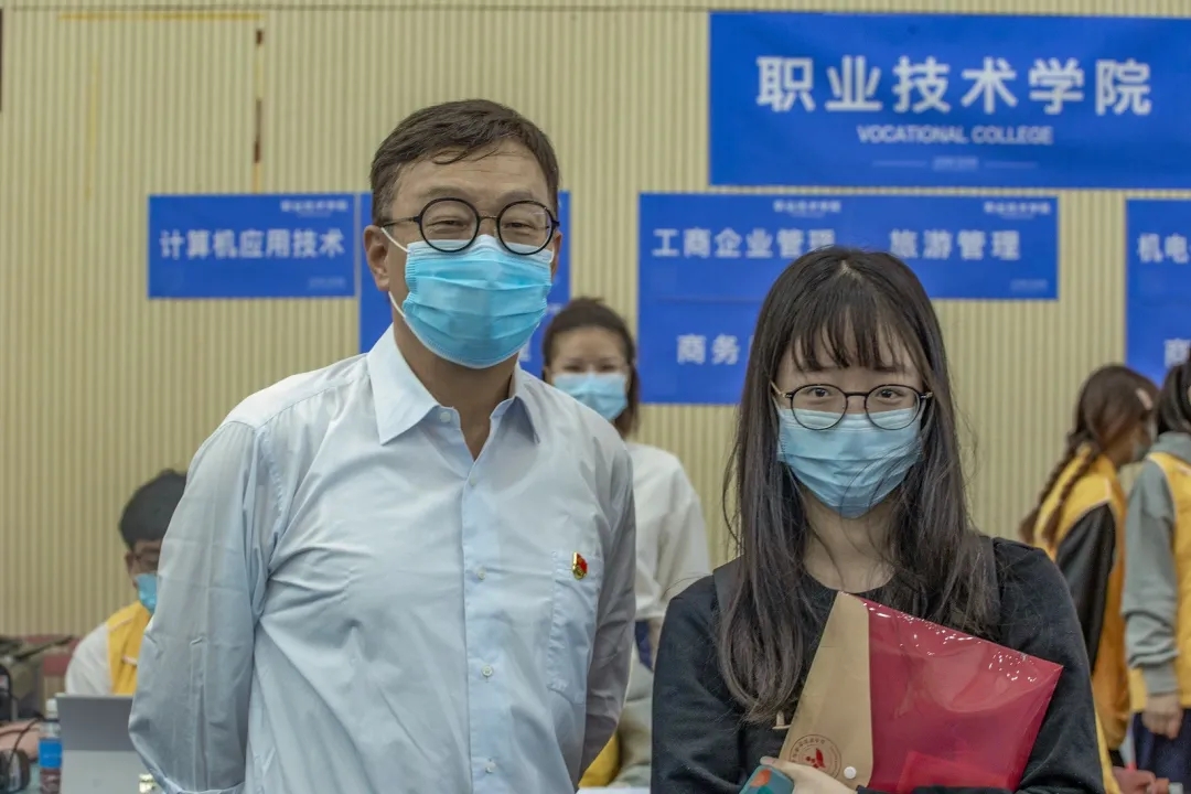 报到现场,职业技术学院谷伟院长、王加宁书记、汤以范副院长,院办以及各系主任们也纷纷前来迎新报道点助力学院迎新工作,关心所有前来报道的新同学们,同时慰问工作在一线的2020级新生辅导员和志愿者们,并与新生家长亲切交谈。王加宁书记在迎新现场指导迎新工作,与所有工作人员一起迎来了第一位前来报道的2020级商务日语李悠悠同学,并亲切地与该同学沟通交流。