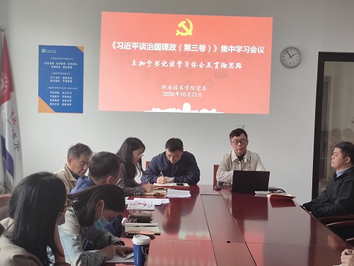 10月22日下午,职业技术学院召开全院教职工大会,开展党的理论专题学习活动。会议由院长谷伟主持,党委书记王加宁、党委委员陈少东主讲,副院长汤以范、党委副书记潘明芸出席,全院教职工参加。