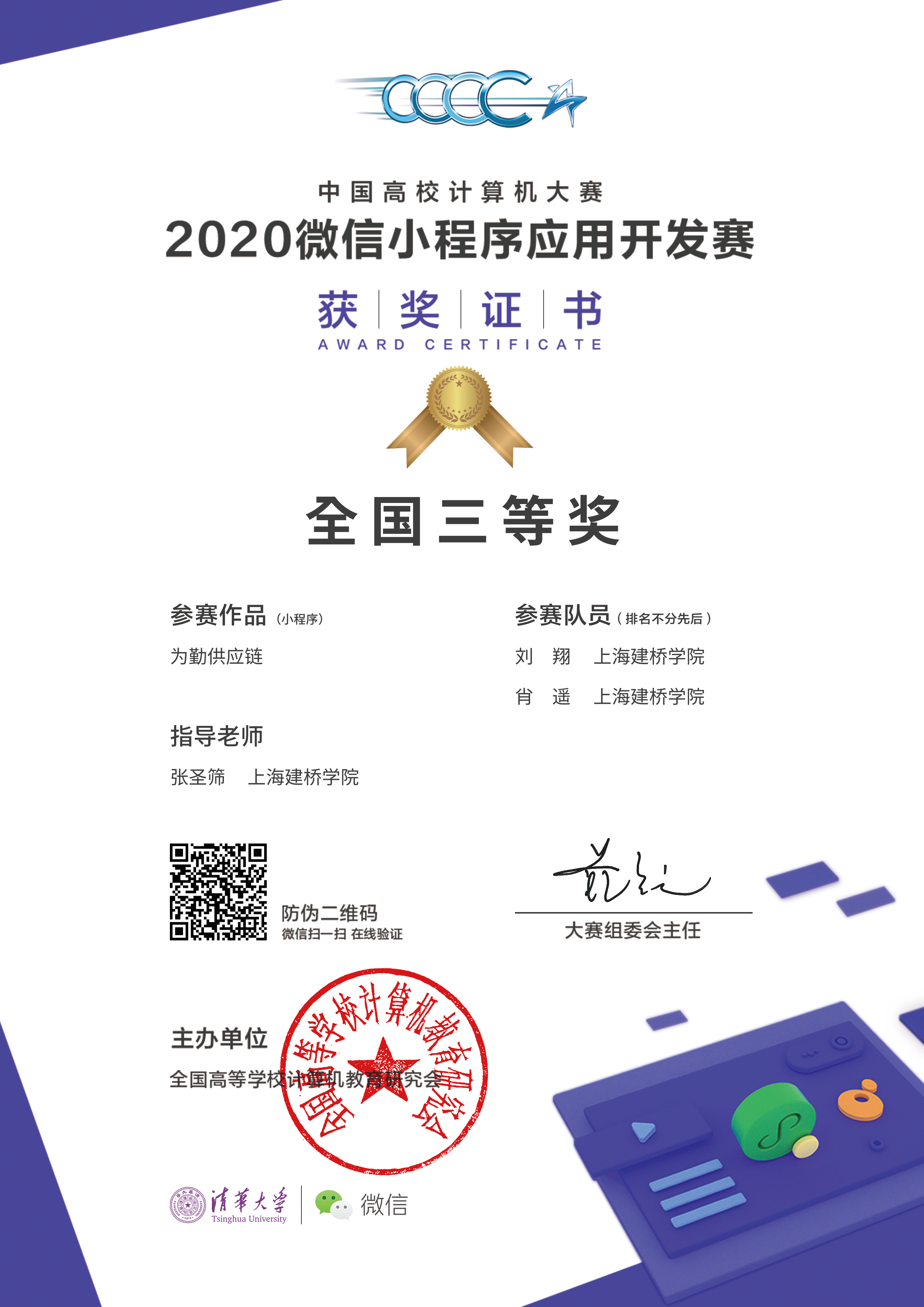近日,2020年中国高校计算机大赛——微信小程序应用开发赛落下帷幕,我校信息技术学院软件工程系“为勤供应链”团队在华东地区高校组成的400多支队伍中激烈角逐,经过四个多月的线上评审,最终获得华东赛区一等奖、全国三等奖的好成绩。