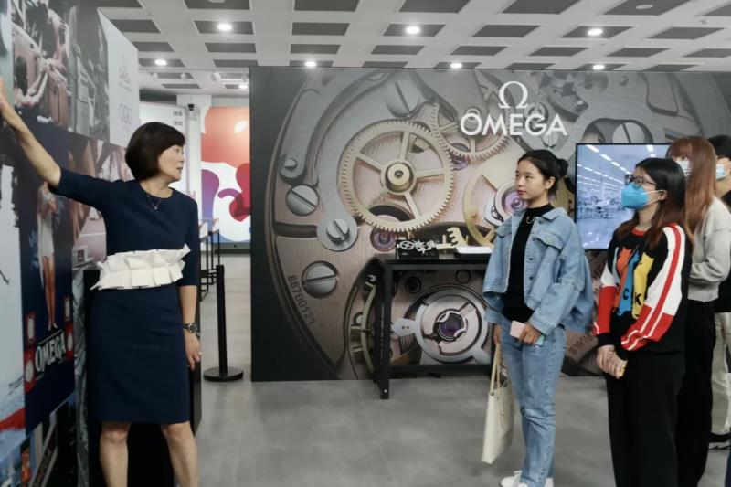 宣讲会开始之前,贲敏和王进在珠宝学院楼一层大厅带领同学们参观展厅,介绍了欧米茄在航天、奥运会上取得的成就和其内芯运用的同轴擒纵技术以及品牌的名人大使。同学们在现场认真聆听、积极互动。