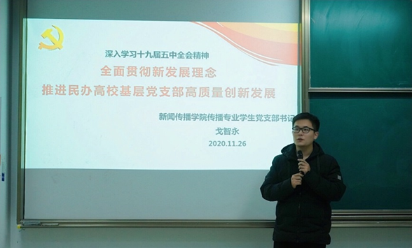 传播专业学生党支部,在党支部书记戈智永老师主持下,围绕“学习党的十九届五中全会精神,全面贯彻新发展理念,推进民办高校基层党支部高质量创新发展”主题,深刻具体从“会议精神”“新发展理念”“推进民办高校基层党支部高质量创新发展”进行全面解读与详细讲述。