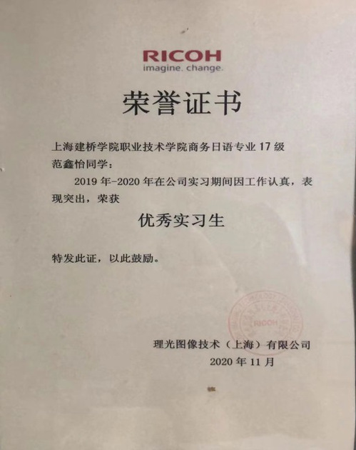 讲座开始前,刘玉君代表公司为17级商务日语专业毕业生范鑫怡同学授予“优秀实习生”称号,并勉励范鑫怡同学在今后的学业上再接再厉,继续努力。范鑫怡同学系职业技术学院商务日语专业17级毕业生,通过学校推荐及公司严选,今年年初进入理光图像技术(上海)有限公司财务部实习。在实习过程中,认真负责、虚心学习,得到公司认可和称赞,经实习考核被授予本年度公司“优秀实习生”称号。职业技术学院教学院长汤以范、应用外语系系主任左翼参加了授奖仪式。
