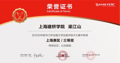 11月27日,2020年“新华三杯”全国大学生数字技术大赛预赛成绩正式公布。信息技术学院学生许文杰、黄子福、梁江山、叶梓炜4位学生在网络工程系系主任蒋中云的指导下,获得1项一等奖,3项三等奖的好成绩。许文杰同学获得市赛一等奖,进入国赛。