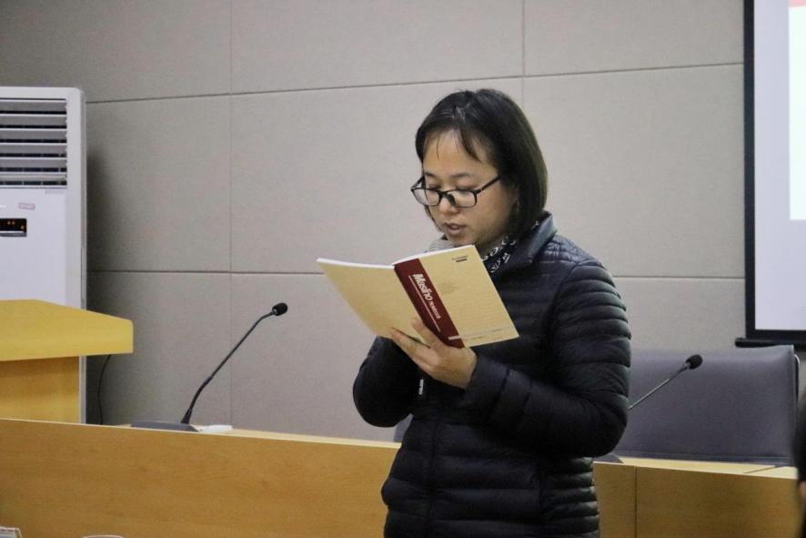 活动开始,新闻传播学院党委副书记吴成皓带领全体党员重温了入党誓词,让每位党员铭记初心使命。随后,辅导员贾存忠、卢倩倩老师领唱红色歌曲《我和我的祖国》。“我和我的祖国,一刻也不能分割。”红歌嘹亮唱起,在全体党员深情的歌声中,爱国主义情怀深入心中。