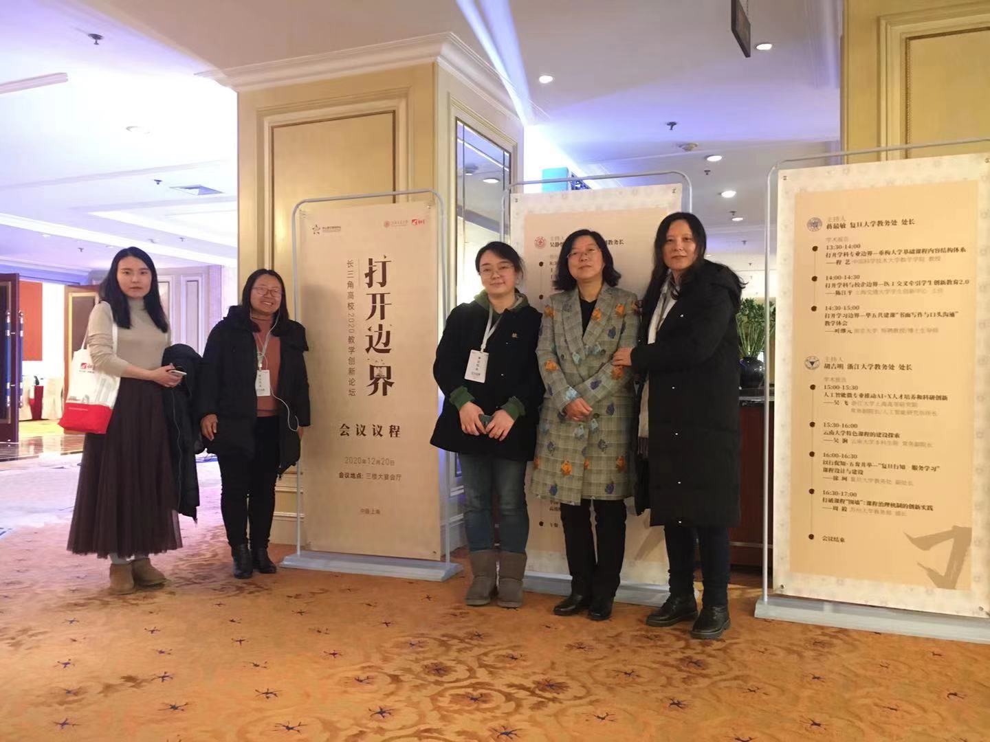 为深化本科教育教学改革,加强长三角区域高校集群发展,助力中西部高校加快提升教育教学水平,促进高校优质课程的共建共享,探索一流本科教育与区域教学协作的新内涵、新模式、新路径,由“华五”(复旦大学、南京大学、上海交通大学、浙江大学、中国科学技术大学)教学协同中心主办,上海交通大学、超星集团共同承办的“打开边界——长三角高校2020教学创新论坛”于2020年 12月20日在上海举行。我校教务处副处长荆筱槐、商学院教学副院长尹卫华、信息技术学院教学副院长矫桂娥、珠宝学院教学副院长赵靖娜、教发中心白鹤五老师参加了会议。
