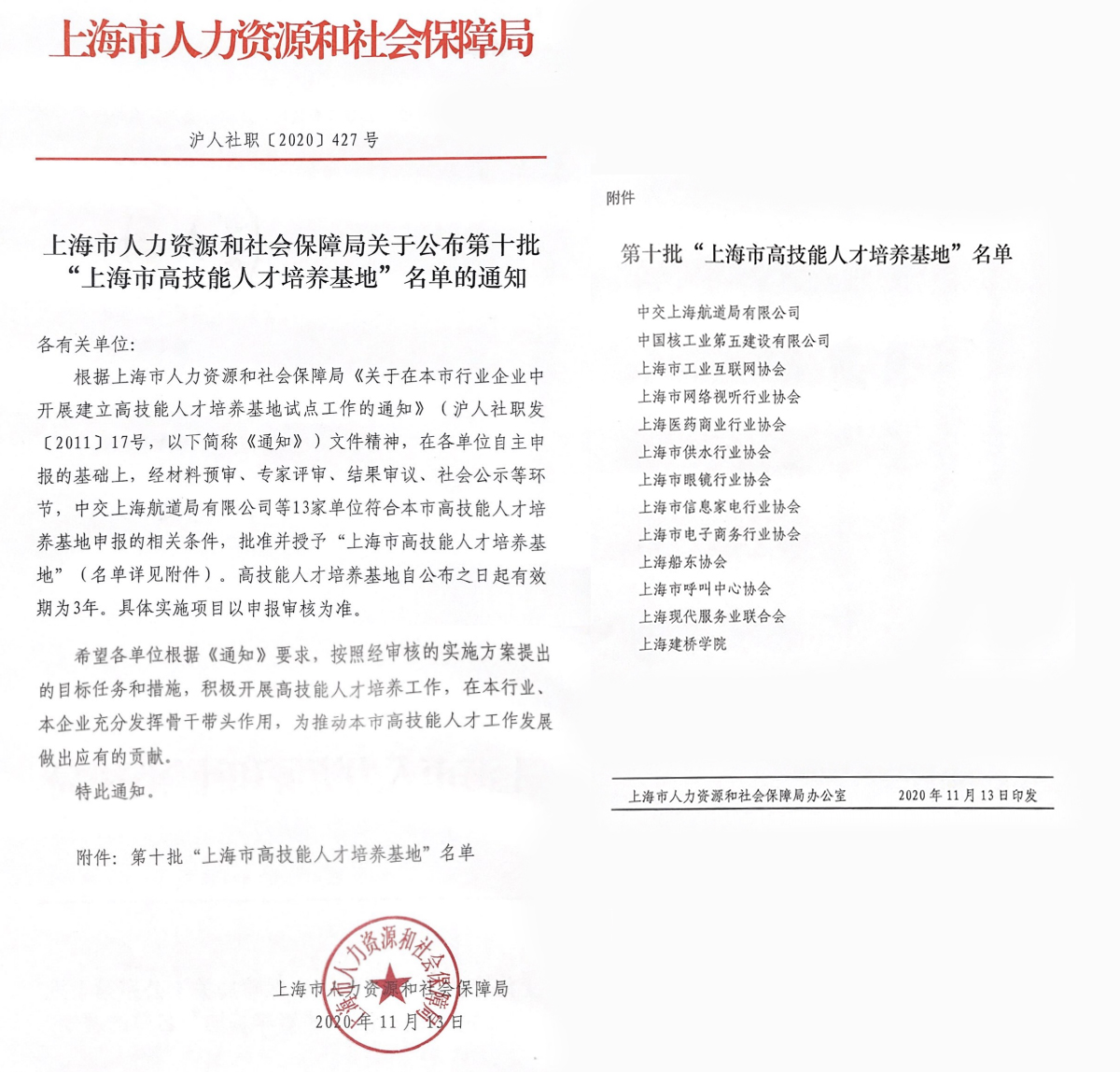 根据《关于在本市行业企业中开展建立高技能人才培养基地试点工作的通知》(沪人社职发〔2011〕17号)、《关于印发<上海市高技能人才培养基地建设“十三五”(专项)规划>的通知》(沪人社职〔2016〕480号)的文件要求,我校申报了2020年上海市高技能人才培训基地建设项目,经市人力资源与社会保障局审核与专家评审,2020年12月上海建桥学院高技能人才培养基地成功获批。