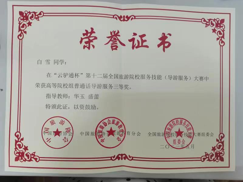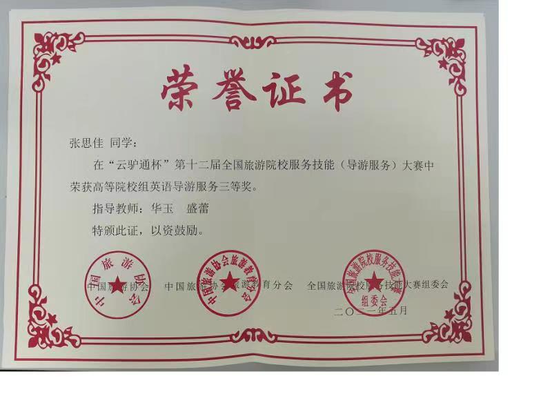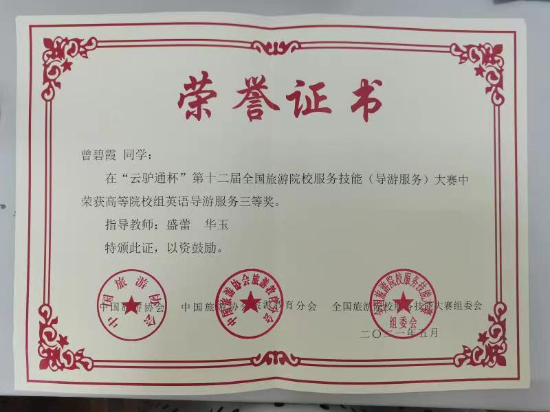 5月13日至16日,由中国旅游协会指导、中国旅游协会旅游教育分会主办、青岛酒店管理职业技术学院承办的“云驴通杯”第十二届全国旅游院校服务技能(导游服务)大赛在青岛举行。经过理论考核、模拟导游、才艺展示三个环节紧张激烈的比拼,我校商学院旅游管理系参赛队获团体三等奖、优秀组织奖,参赛选手葛潍嘉、白雪获高等院校组普通话导游服务三等奖,张思佳、曾碧霞获高等院校组英语导游服务三等奖。