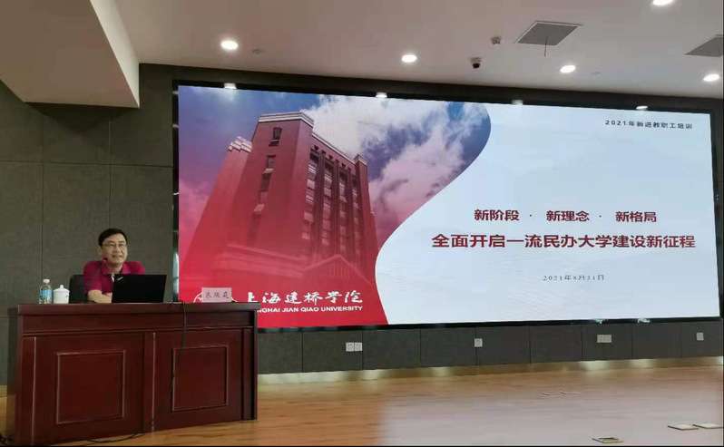 朱瑞庭校长作了题为“新阶段、新概念、新格局,全面开启一流民办大学建设新征程”的报告。他从学校的历史沿革、办学理念、学科专业、专业建设、毕业就业、教学成果、分类评价、社会责任、品牌荣誉等角度对学校作了全面的介绍,重点介绍了学校以卓越建桥计划为载体的顶层设计,学校强化教学中心和深化产教融合的思路与举措以及全面质量管理体系的建设。朱校长还给新教职工介绍了学校“十四五”规划的主要目标、关键指标和重点任务。朱校长指出学校将以“十四五”规划的实施为契机,继续遵循应用技术大学办学定位,坚持“育人为本,教学为本,本科为本”的教育教学理念,“以人为本,德育为先,依法治校,严格管理”质量方针,抓住长三角一体化、上海自贸试验区临港新片区建设的历史性机遇,立足临港、融入浦东、服务上海、辐射长三角,以培养专业硕士人才,深度推进产教融合和教育国际化,加快智慧校园建设为重点,加强学校治理体系和治理能力建设,努力把学校办成一所特色鲜明的应用技术大学,力争在国内一流民办大学建设中实现新突破。最后朱校长向新教职工提出了要求,希望他们要不忘建桥初心、牢记办学使命,继承建桥优良传统,维护建桥品牌;抓住机遇,开拓创新,在变局中开局;加强作风建设,求真务实,克服懈怠、畏难情绪,敢担当、有作为;加强能力建设,尽快提升面对复杂情况、解决急难险重任务的能力,为办人民满意的教育,建全国一流的民办大学贡献自己的力量和智慧。