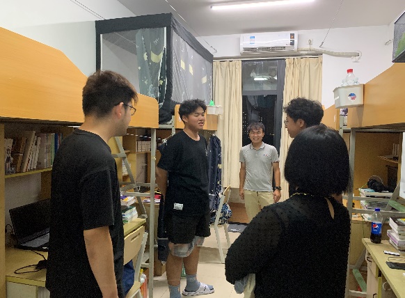 在当晚排查中,同学们晚间学习氛围浓厚,寝室卫生整洁,总体较好。在走访过程中周书记关心同学们在校园的生活和学习,提醒同学们一定要注意寝室卫生,不要使用违禁电器,国庆假日注意安全等,引导同学们过健康安全的校园生活,争创模范之家、文明寝室。同学们积极向学院书记、辅导员们汇报自己的学习生活情况,呈现积极向上的良好状态。