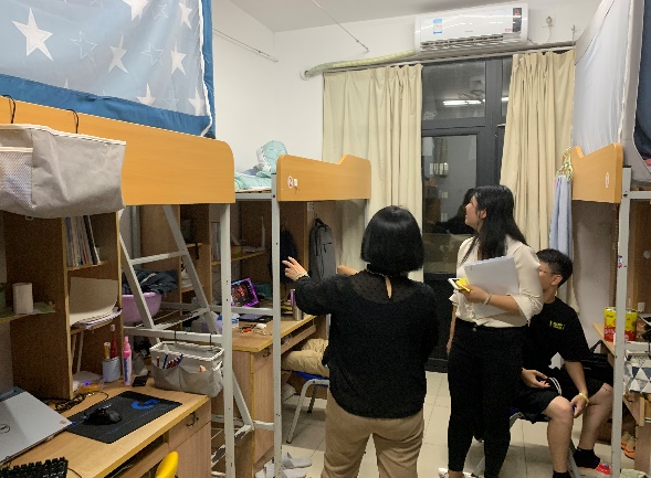 9月29日晚,国际教育学院党总支书记周英芬带领辅导员们走访A区、B区30多间寝室,开展了宿舍安全隐患排查活动。