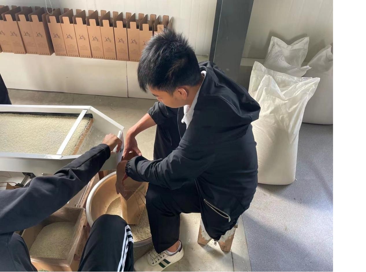 志愿者们在淼洋果蔬合作社进行水稻后期包装运输工作,第一步将事前收好的大米装进麻袋,再把麻袋中的大米倒入机器,由机器挑选颗颗饱满,圆润的大米粒,最后将机器挑选好的米粒倒入精美的包装袋子中,并且要保证每袋重量相同。