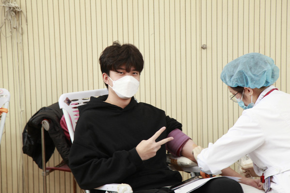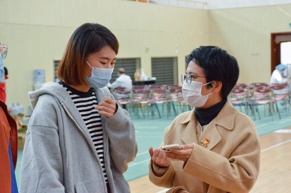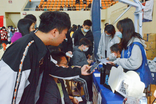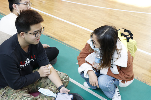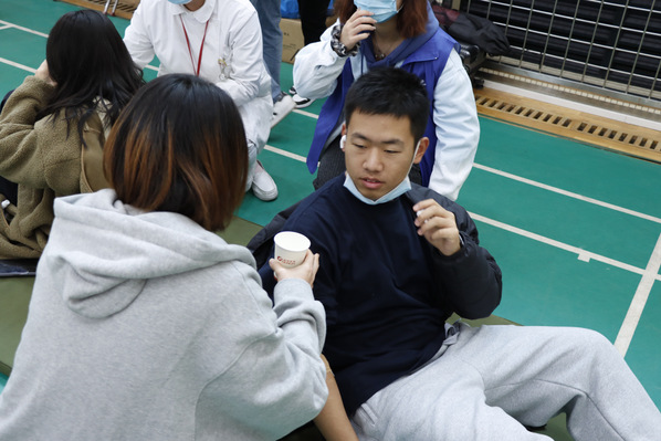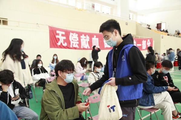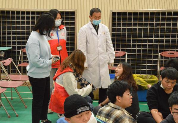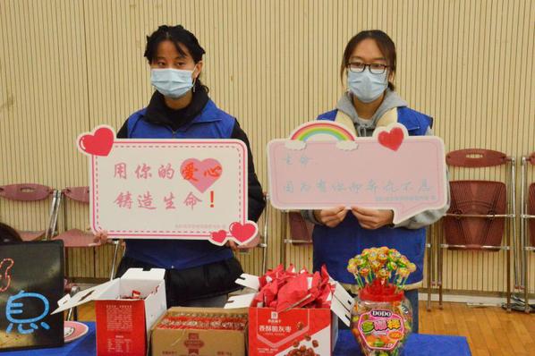 在学院补给站,志愿者们手拎补品在献血等候区为同学们送上温暖,询问着同学们的身体情况并耐心录入献血同学的信息,天气很冷,但大家的心暖暖的。