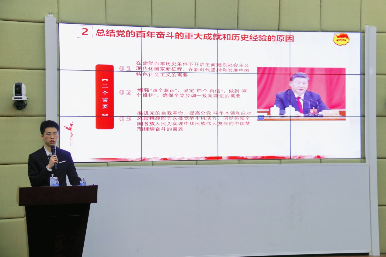 会议伊始,主持人通过图文的形式为大家介绍了十九届六中全会参会人员、大会时间以及大会主要议程等重要信息,带领全体同学紧跟时事,更加深入了解在中国共产党走过百年光辉历程的重要时刻,站在“两个百年”历史交汇点上召开的这一重要会议。