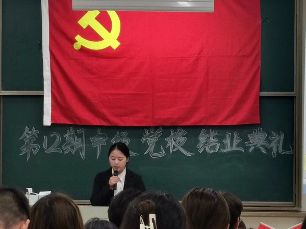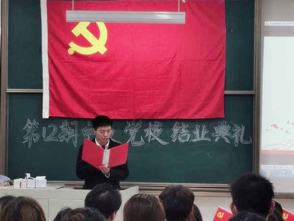 典礼伊始,全体与会人员起立,奏唱国歌。随后第12期中级党校班长、学生党支部学生党员封佳就本次党校的学员情况、党课内容以及学员成绩等做汇报总结说明。本期优秀学员代表刘猛及优秀干部汪玲做交流发言,并由刘衔宇院长和张维生书记为优秀学员和优秀班干们颁发荣誉证书。