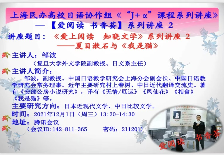 12月1日, “爱阅读书香荟”导读专题讲座通过线上平台举行,活动主题是“爱上阅读知晓文学”,活动由图书馆、职业技术学院主办,科研处协办。旨在加强日语专业第二课堂学生日语学习的交流,营造浓郁书香校园气氛,激发学生阅读热情和兴趣。