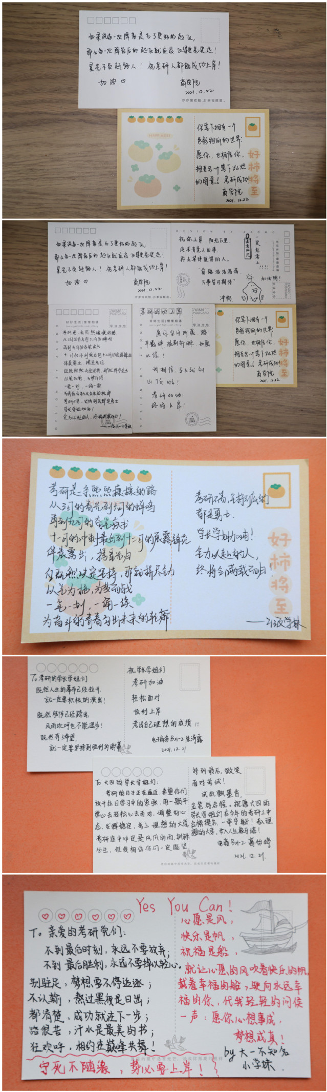 考研学子们收到学院师生的祝福卡片,纷纷表示感谢学院教师的关心和学弟学妹们的祝福,他们定将全力以赴,不负韶华,努力取得优异的考研成绩。