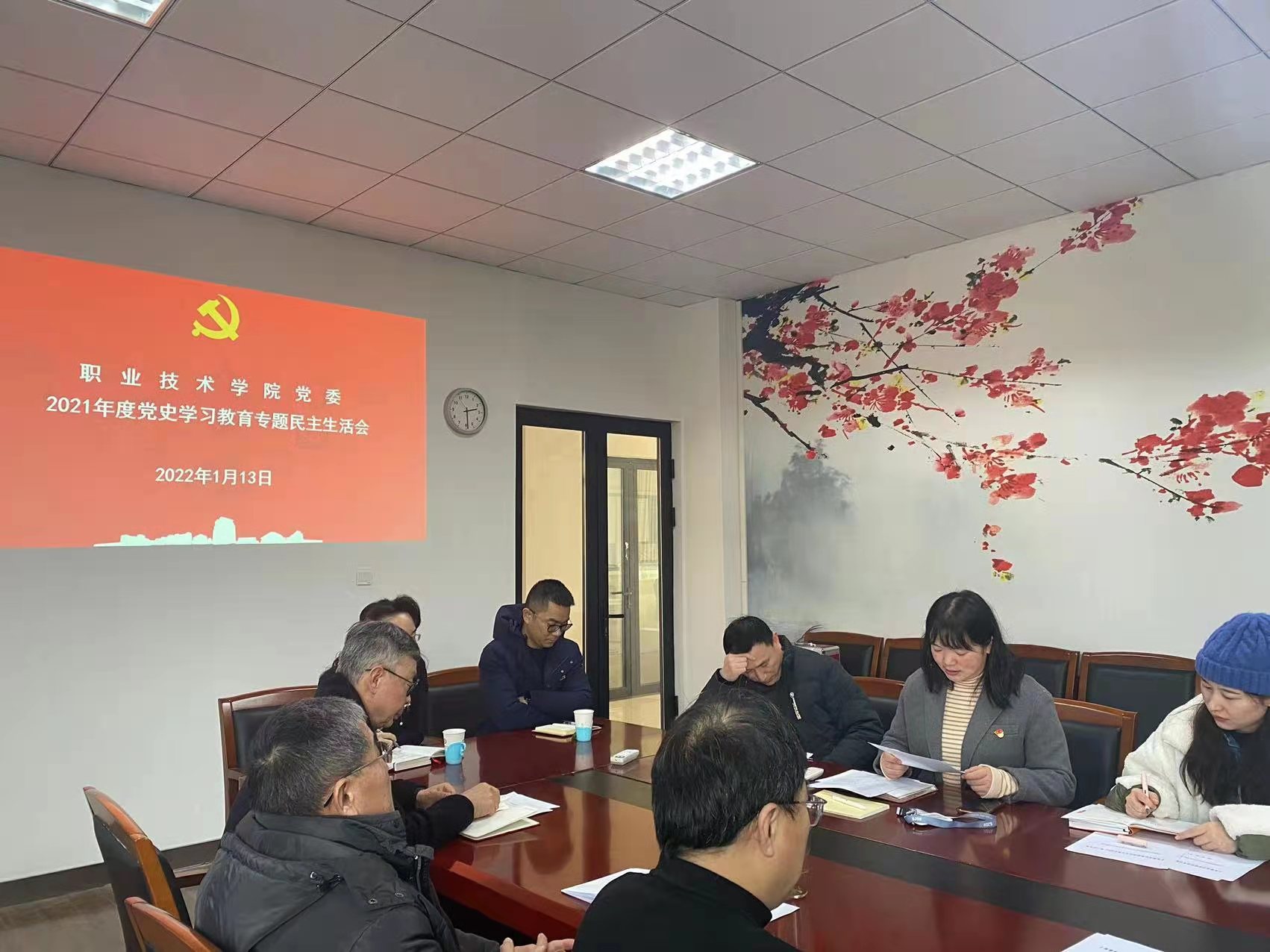 1月13日下午,职业技术学院党委召开2021年度党史学习教育专题民主生活会,全体党委委员、各支部书记以及学院教代会代表共15人参加会议,陈伟副校长,校院联络人、学生处处长张巍与会指导。