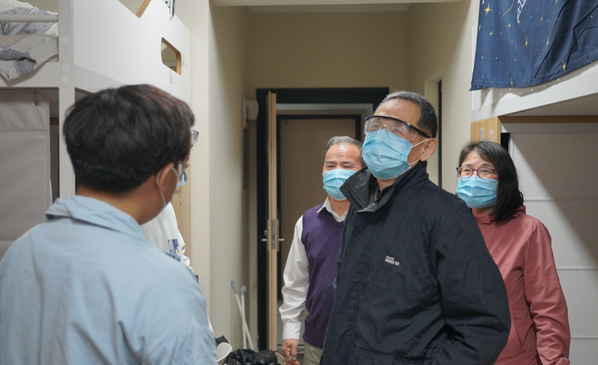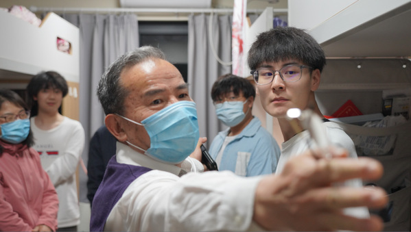 在寝室,老师们与同学们进行亲切交流,同时强调指出在疫情防控形势严峻的背景下,每位同学都要绷紧疫情防控之弦,绝不能松懈。陈志澜院长提醒同学们注意保持个人生活卫生和寝室环境的干净整洁,勤洗手、勤通风,及时清理宿舍垃圾,做好自我防护。都海良副院长关心同学们的寝室学习生活状态,亲切询问同学们网课期间的适应情况。