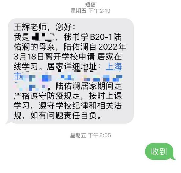 为确保在上海有固定住所的学生有序离校并正常参与正常学习,王辉老师与每一位学生“点对点”联系,确保每一位学生能够顺利、安全到家,健康、高效地参与线上学习。3天之内,王辉老师的68名学生顺利离校返回本市住所,并在各自社区、小区的防疫要求下生活与学习。