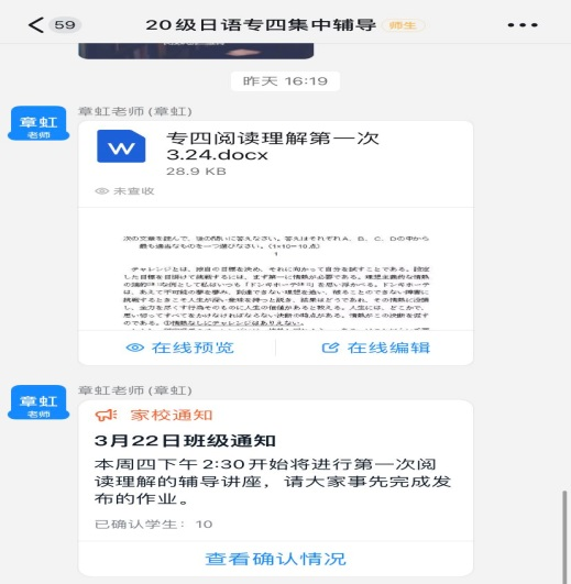 为保障日语专业学生顺利通过日语专业四级考试,教师党支部党员教师齐上阵,主动利用课外时间,一周两次,平均每位教师负责5-6名学生的专四线上辅导答疑工作,一个也不落下,发挥辅导小组小而精的优势,根据考题特点,着重为学生讲解专四知识点和进行真题训练,还发布模拟考题、分享知识点提要。