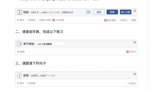 通知线上授课后,陆惠雯老师对课程授课方式进行了完善,同时将超星平台和钉钉群共同作为教学、直播、练习和实时沟通工具,针对各班班长还另外开设了微信小群进行紧急事项和班级整体情况的沟通。除了前三周已上传的内容之外,在超星平台上传课程内容截图及音频,供学生事先预习,并提供章节测验(单词翻译、连线)邀请学生在课前完成。针对每一部分专门录制了一份讲解视频,供学生课后复习使用。针对每一个单元设置了单元章节测验作为任务点让学生完成,章节测验包括选择、填空、翻译、排序、口语题等,在上课时及上课后请学生作答并进行批改,于下一节课上给予反馈。