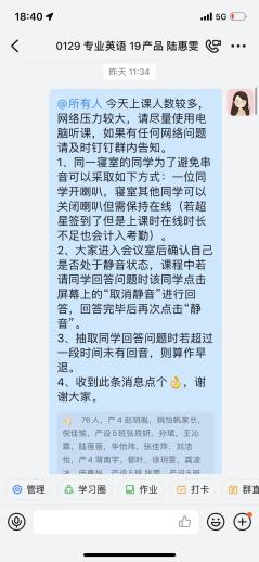 本课程为钉钉直播上课为主,但因为直播上课无法即使关注学生的听课情况,因此融入了不同提问方式,包括点名开麦回答问题、钉钉留言回答问题、超星章节测验选择题回答方式等。在课前提醒学生要及时跟课,如果发生失联过久的情况即算作早退。