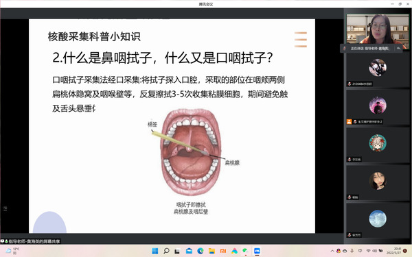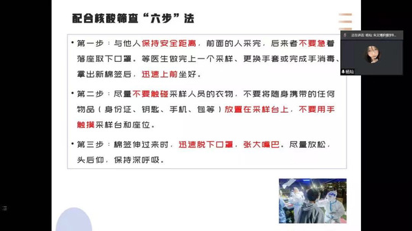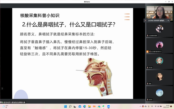 为提升社员对于防疫知识的专业认知和相关操作技能,特邀社团指导老师黄海英为社员们进行核酸采集技能讲解,具体介绍了口咽拭子和鼻咽拭子及区别;提醒核酸采集注意事项;区分抗原自测和日常核酸检测两者之间的差异;通过规范操作视频的学习,学生更加直观地掌握了抗原自测流程、注意事项。同时引导鼓励社员从自身专业出发,利用专业所长,在特殊时期做好个人防护的前提下,不忘发挥先锋模范带头作用,以青春之力为学校为社区为社会的抗疫工作贡献自己的一份力量。