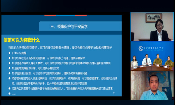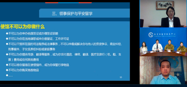 海外新冠肺炎疫情依然严峻,日本政府近期进一步放开了对国际学生的入境限制,为体现党和国家对留学人员的关心关爱,切实增强广大留学人员的安全防范意识,提高应对各种风险的能力,教育部中国留学中心联合中国驻日本大使馆于东京时间4月8日(周五)15:30,北京时间时间4月8日(周五)14:30,举办平安留学伴你行日本线上专场活动。我校国际教育学院组织中日合作项目内的教师、辅导员、学生联合观看了线上培训会。