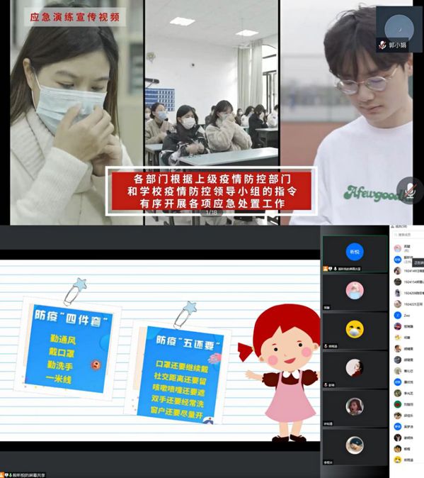 面对校园复杂严峻的疫情防控工作,教院的学工团队密切关注官方渠道发布的各类信息、公告,通过大大小小的线上主题班会,做好疫情期间的思政教育工作,引导学生正向思考、高度配合、减少焦虑、不信谣不传谣,按要求做好个人防护,提高大局意识。通过线上主题班会,同学们也清楚了解了现在疫情的严峻性,自发地积极配合疫情防控工作,期待着疫情退散、春暖花开。