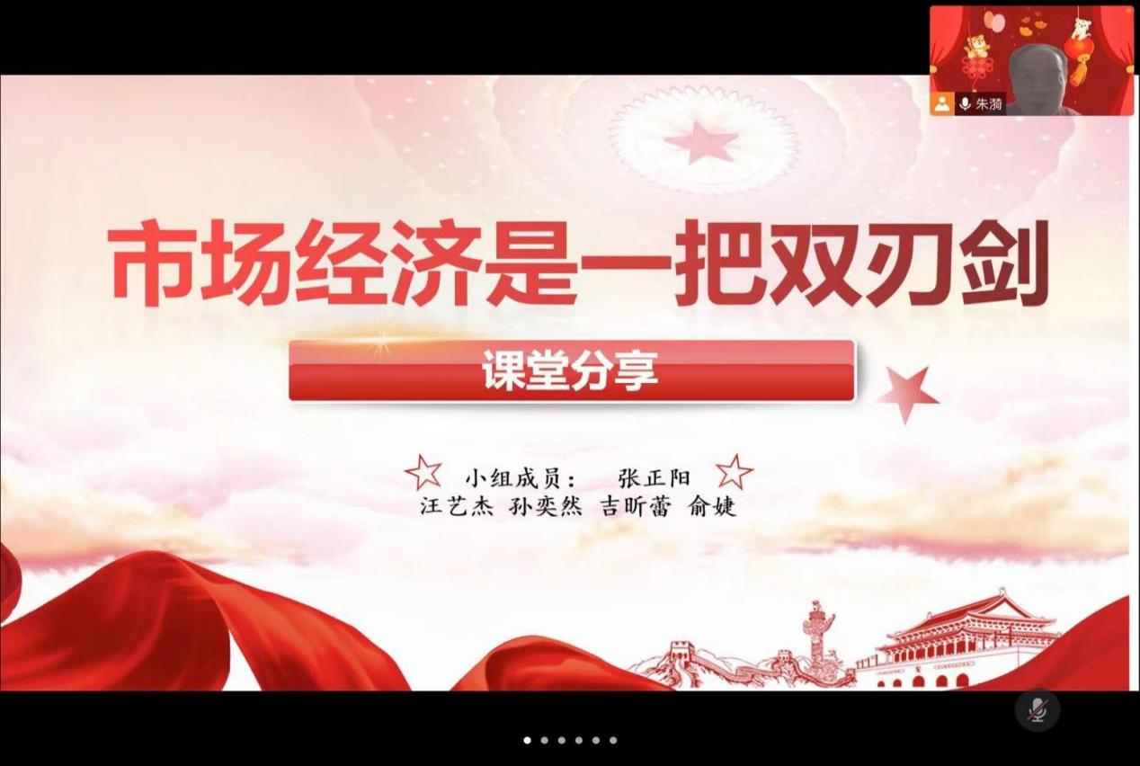 最后是师生共讲。整个教学过程始终是在朱漪教授的组织下进行的师生共讲,不是机械的师生分隔开的教学对立过程,而是师生交流共讲的互动过程。学生点评时政新闻,朱漪教授给予了充分的肯定,同时拓展了新闻的内在价值;教师精讲过程,他不停地通过提问对话方式启发学生,与学生一起研究重难点知识。学生主讲教材知识,他更是做好辅导点评工作,引出其中的话题做深入探究。随堂练习,在他启发下让学生自己寻找答案,完成知识点的精细化和准确化。师生互动较为频繁,克服了教师一言堂的现象,比较好的实现了网课学生实实在在在线学习的实际效果,也赢得了学生好评。