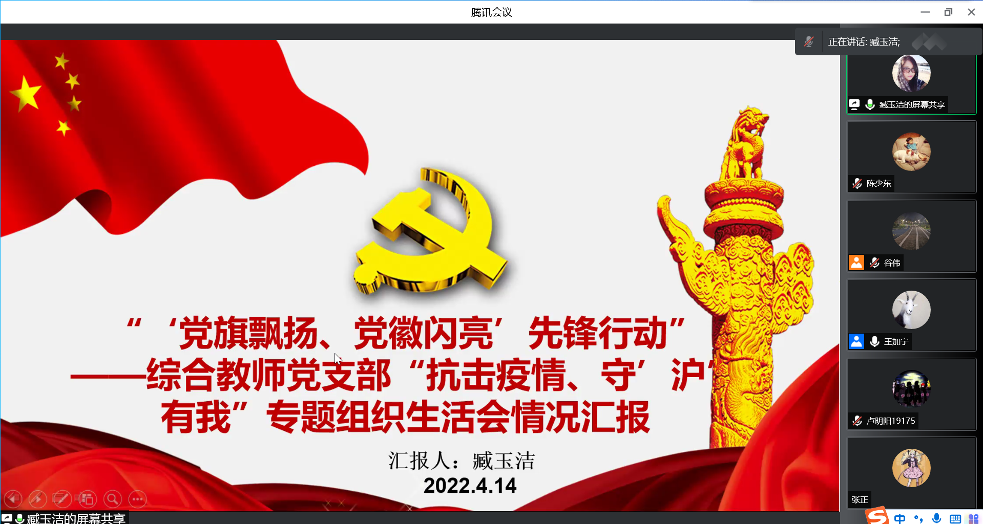 王加宁书记带领与会党员学习孙春兰副总理在沪调研疫情防控工作的重要讲话精神及中共上海市委《致全市共产党员的公开信》,结合当前上海抗疫工作情况,号召学院全体党员“四要”,紧急行动起来,尽锐出战、持续奋战,无论是校内校外,均积极投身到这场严肃的抗疫斗争中去。王加宁书记指出,关键时刻最要求体现党员先锋模范作用,全体党员要牢记入党誓词,以高度的责任感,投身到战疫一线,在线上授课、社区志愿、学生关怀和网络舆情引导等方面发挥作用。王加宁书记还传达了校党委副书记夏雨在校党委理论学习中心组(扩大)学习会议上专题部署《关于组织开展“‘党旗飘扬、党徽闪亮’先锋行动”党支部专题组织生活会》的有关工作要求。